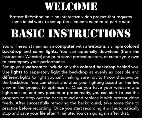 Click the above link for detailed instructions on setting up a backdrop and lighting for chroma keying and using the project interface to get optimal results. Also a link to a repository for downloading and printing protest posters to use to enhance your video performance