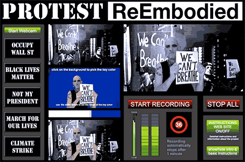 Protest ReEmbodied is an app that allows participants to take part in protests virtually, from their home, in their own time. It makes it possible for people who cannot physically attend protests to digitally insert themselves in protests, creating video files they can then upload to social media and participate virtually. It enables people with disabilities, vulnerable people during the CoVid19 pandemic (or those not wanting to potentially expose themselves), people distant or otherwise removed from the protests and more, to participate and have their voices heard.