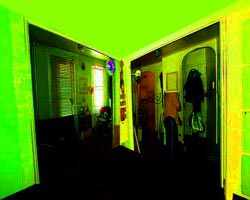 windows are blacked out). Digitally collaged