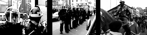 and banners, cop sirens and loud hailer commands for police