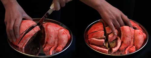 ritualistically cuts it, offering slices to the audience for eating. As she presents
