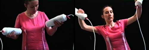 each slice to a member of the audience, she delivers a spoken text. The texts