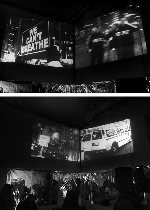Protest BLM @ Hotel Chelsea Loves Art (2016), is a 2 channel video installation with audio, depicting the protesting of the Eric Garner killing. It splits the documentation into two streams, presented on either side of a corner, with the protestors on one side and the police on the other, coninually facing off with each other in a 15 minute loop.